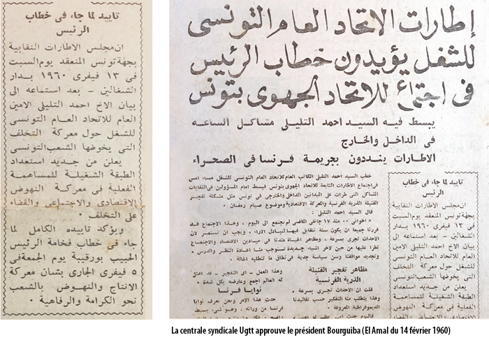 Ces accusations outrancières ne constituèrent qu’un des moyens employés par le régime et ses structures d’encadrement et de propagande contre la contestation du programme moderniste de la jeune et très autoritaire république. Les relais médiatiques furent mis en action et n’hésitèrent pas à recourir à l’intoxication. C’est ainsi que le journal El- Amal en date du 17 février 1960 publia, à la une, des titres mensongers tels que «Le mufti de Tunisie et le recteur de la Zitouna appuient théologiquement le discours du Président.» Quant à la déclaration – pourtant sans ambiguïté - du cheikh Ben Achour, elle fut reproduite mais tronquée, afin de semer le doute dans l’esprit des lecteurs. Le formidable appareil du Néo-Destour fut, bien entendu, mis à contribution. Les nombreuses cellules qui quadrillaient le territoire ainsi que les organisations nationales dont l’Ugtt furent mobilisées pour orchestrer «l’adhésion totale des masses autour du leader». Les télégrammes «spontanés» d’appui inconditionnel au chef de l’Etat affluaient de partout. Les rapports de fonctionnaires affirmaient que le discours du Palmarium «est favorablement accueilli ». Il arriva même que l’on informât un supérieur hiérarchique que «les récalcitrants sont généralement des vieillards ou des simples d’esprit». Enfin, des déjeuners officiels ou de travail furent organisés par provocation, en plein Ramadan et les figures de l’opposition qualifiées «d’insectes». Les prises de position de ces personnalités seraient dues «à l’aigreur de dignitaires déchus et de prévaricateurs punis par les temps nouveaux.» (in El- Amal du 27 février et numéros suivants).